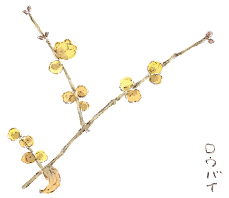 お正月からコロコロの可愛い花を咲かせるロウバイ。冬の軽やかな青空にハチミツみたいな黄色が映えていました。空は塗らなかったので、皆さまのイマジネーションで背景に青空を足していただけると幸いです。 今日は成人の日ですね!新成人の皆さん、おめでとうございます。(^-^)