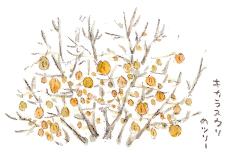 近所にキカラスウリに枝を貸してあげてるサクラの木があります。「冬は枝が空いてるから良いよ」って感じです。まるでキカラスウリの木みたいに黄色い実が沢山ぶら下がってゆらゆら♪