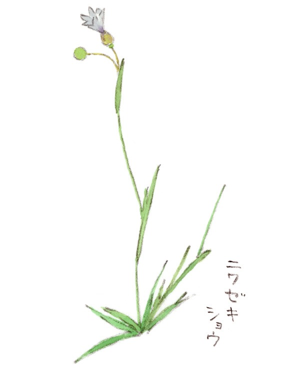 ブタナのスケッチをしていたら、そばに薄紫の小さな花がそっと咲いていました。ニワゼキショウでした。公園などで見かける赤紫の花と違って、控えめな咲き方の種類でした。アクセサリーみたいなつやつやした丸い玉の実が可愛らしいです。