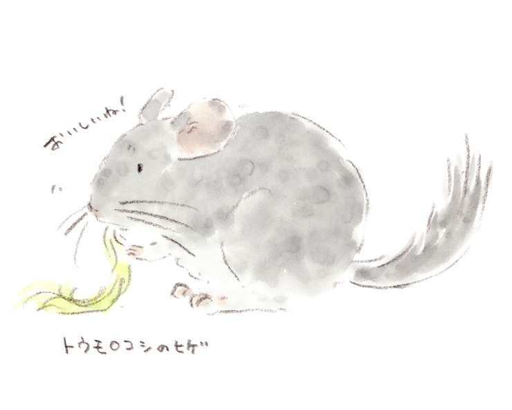 夏はトウモロコシが美味しいですね。わが家のチンチラ(福ちゃん)は、トウモロコシの実は食べませんが、ヒゲが好きで、取っておくと喜んで食べます。長いのでしばらく無心な表情でもぐもく。なんだか福にあごひげが伸びたみたいです。