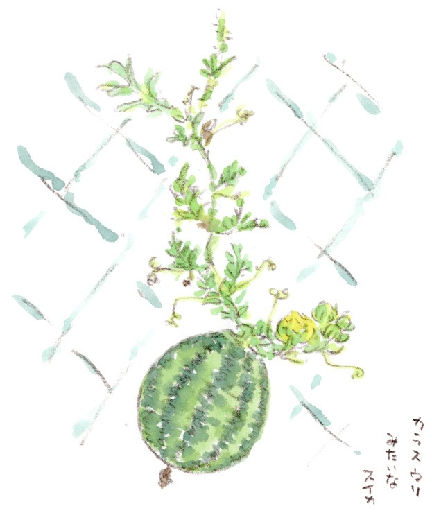 近所の中学校脇にある畑で、フェンスに絡まってカラスウリくらいのサイズに育ったスイカ。大きくなったらどうするつもりなのか、無計画なところが可愛いくてスケッチしました。花も爽やかな黄色で綺麗でした。